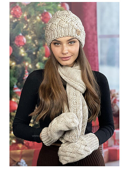 Подробное описание: Шапка женская шарф варежки комплект Дюран светлый кофе
