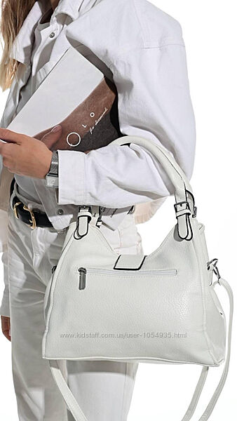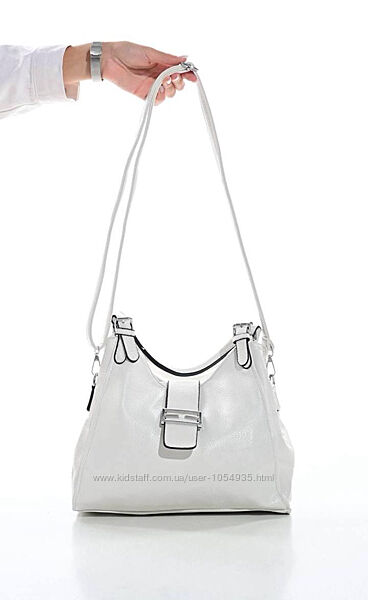 Сумка виготовлена зі штучної шкіри, застібається на кнопку Має три відділи, один з яких на блискавці, 3 кишені, одна з яких на блискавці Позаду сумки є кишеня на блискавці Довжина ручок 40 см, макс. довжина регульованого ременя 142 см Розмір сумки 30*25*10 см Колір: чорний, беж, білий.