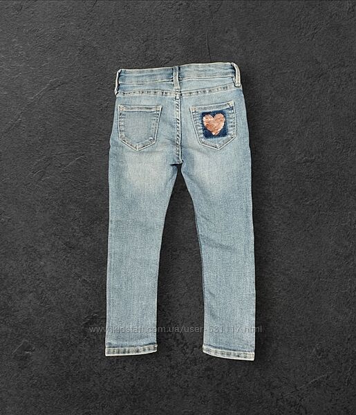 Красиві джинси H&M для дівчинки. Модель skinny fit. Дуже красивого темно-блакитного кольору. Прикрашені аплікацією з пайєтками, яка має дві сторони - рожеву і білу. Пояс регулюється за допомогою резинки утяжки.Розмір 98, на 2-3 роки, але можуть бути і на більше, дивіться заміри.