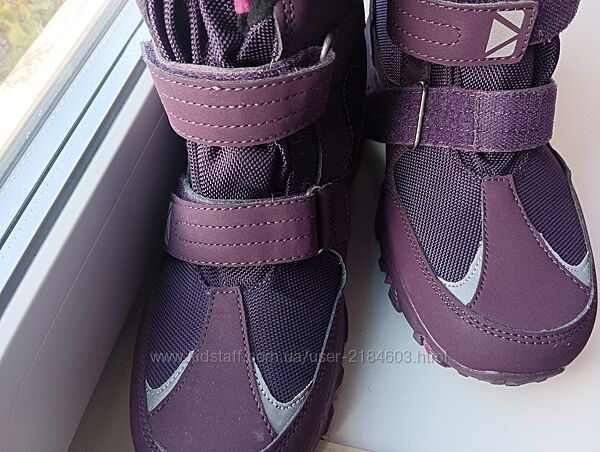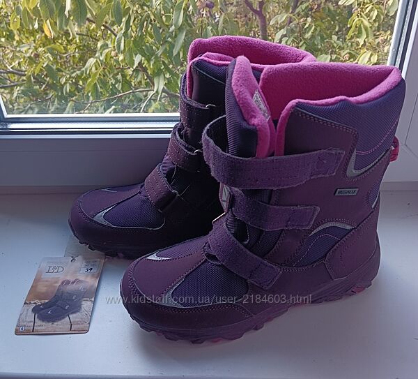 Нові зимові дівочі або жіночі чоботи австрійського виробництва. Сучасна та повсякденна модель. Розмір 39. Довжина устілки 25,5 см. Лілового кольору. Водовідштовхуючий матеріал, міцна подошва, теплі навіть у холодну та промозглу зимову погоду, приємний колір. На липучках. Купувала в Австрії, дуже якісний виробник взуття. Нова пара.