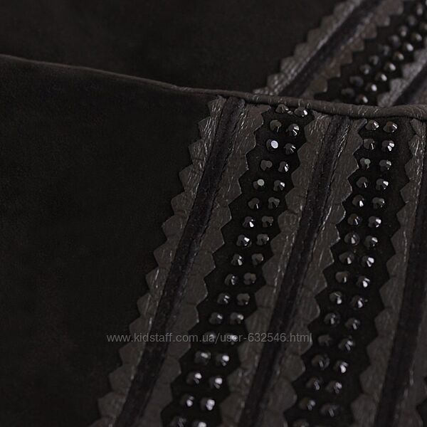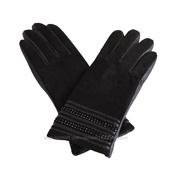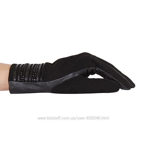 Теплі рукавички з вовняною підкладкою. Манжети прикрашені стразами чорного кольору. Тильна сторона виконана з м´якої замші, внутрішня сторона для практичності - з натуральної шкіри. Довжина (см)24