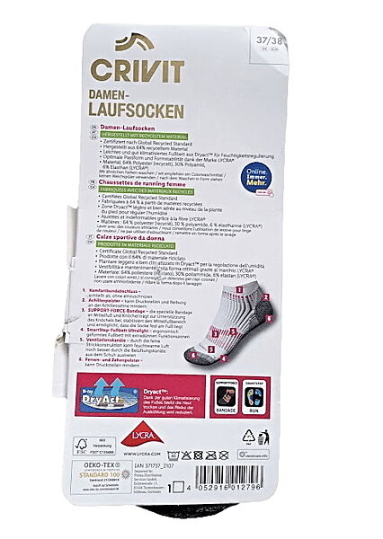 Функціональні спортивні шкарпетки Crivit для інтенсивного зайняття спортом. Амортизуюча підошва для комфорту шкарпетки та п´яти. Найбільш плоскі шви. Зверху трикотажна функціональна структура для оптимальної циркуляції повітря. Оптимальна посадка та стабільність форми завдяки еластану (LYCRA ®).Заміри: надаємо по запиту