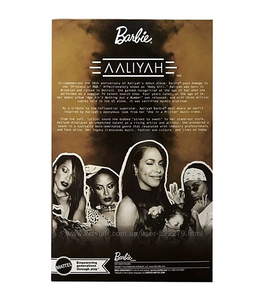 Барбі вшанувала єдину у своєму роді «принцесу R&B», Алію, колекційною лялькою, яка відображає її трендовий і дуже крутий стиль 90-х років. Шкіряний стиль ляльки Алії від Барбі натхненний хітовим кліпом співачки на пісню «One in a Million» – титульний трек її мультиплатинового другого альбому. Її чорний кроп-топ і обтислий штани прикрашені шнурованими деталями з металевими заклепками, а яскраві відтінки, жилетка на блискавці та знімні рукава додають образу натхнення мотостилем.Алія проявила свій талант як перспективна співачка та акторка – її ніжний вокал у поєднанні з футуристичними бітами створив новий і проривний стиль R&B. Її спадщина виходить далеко за межі музики, моди та культури і живе до сьогодні. Лялька Барбі Алія вшановує цю впливову зірку, стаючи незабутнім подарунком як для колекціонерів, так і для шанувальників.