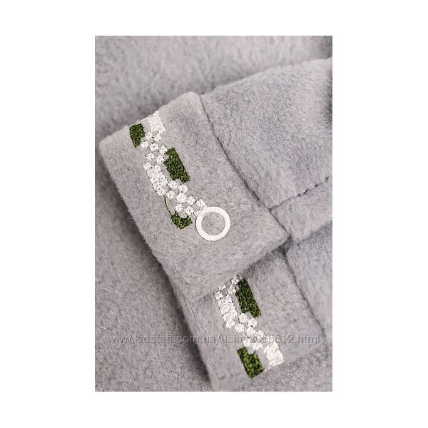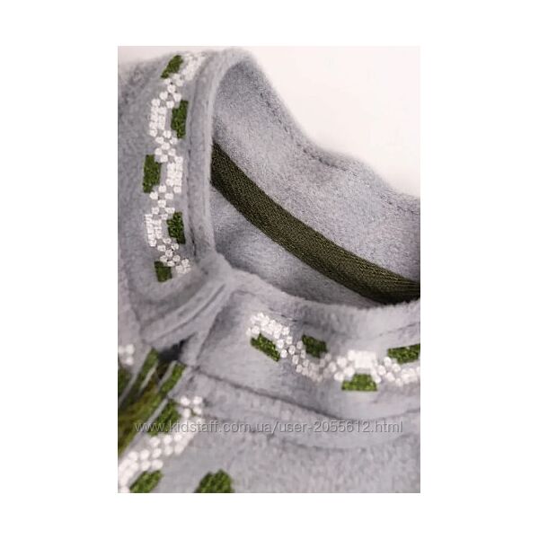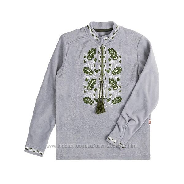 Флісова сорочка для хлопчика сірого кольору прикрашена вишитим орнаментом з жолудями і дубовим листям. Перед, комір-стійка і манжети довгого рукава оздоблені біло-зеленим орнаментом. Застібається на шнурок.Матеріал: фліс