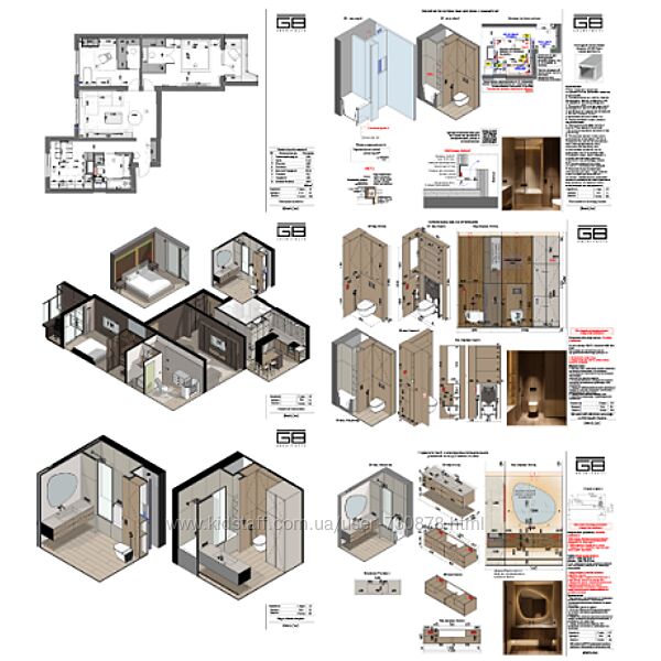 Богатые развертки (чтобы изучить наполнение и расположение оборудования ванной комнаты, где выведены электровыводы, выключатели и встроены розетки, сантехнические выводы, расположение освещения, сантехники, аксессуаров, отметка предполагаемой фурнитуры, уникальные решения и т.д.)
