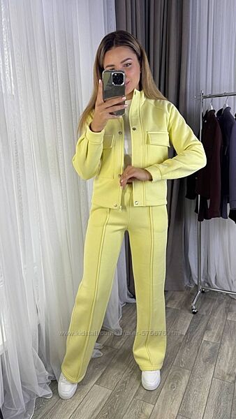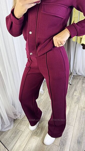 Штани талія на резинці, з карманами. Кофта полуприталена, з двома карманами, застібається на блискавку та кнопки