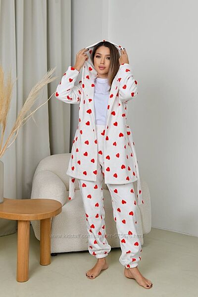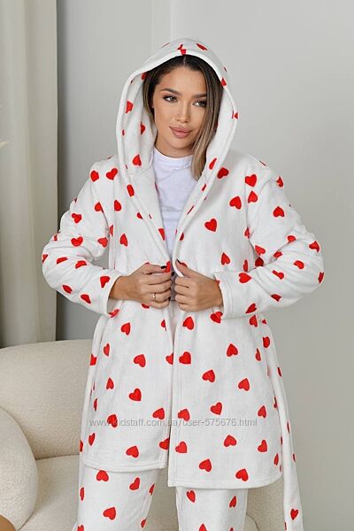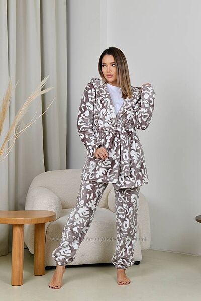 Піжама в якій можна зігрітися і виглядати привабливо .Штани разом з халатиком.По боковим швам на штанях є кишені,по талії еластична резинка .В халаті теж є бокові кишені,пасок і капюшон.Піжама махрова