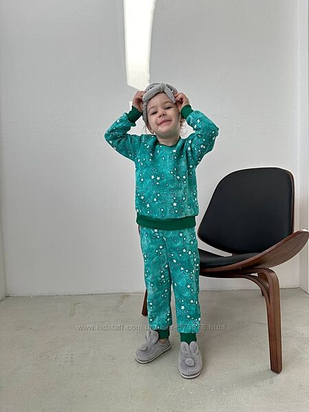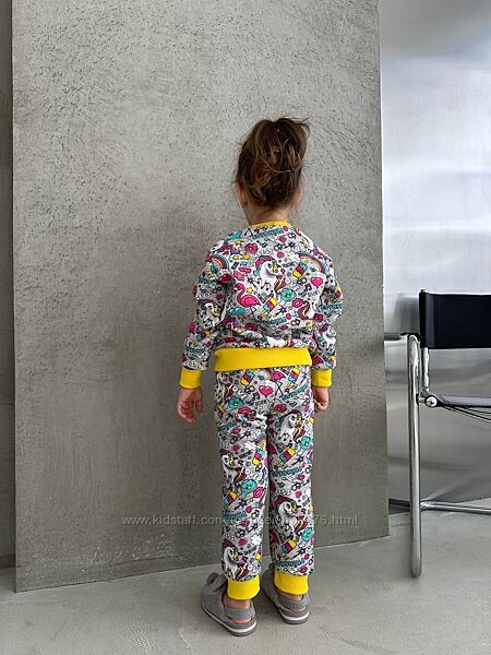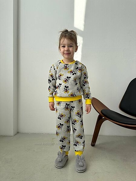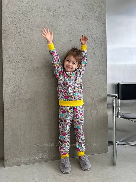 Костюм у садочок , для дому або піжамка для Ваших малюківТепла, з натуральної тканини, зручна та мягенька з улюбленими принтами. Резинка на поясі тонка та еластична, яка підходить для діточок та не давить, манжети з дуже м’якої та еластичної РІБАНИ яка не буде сковувати дитину