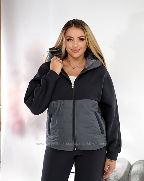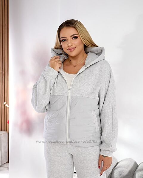 Теплий жіночий прогулянковий костюм складається з кофти на блискавці фасон кажан і штанів палаццо, виконаний з трикотажу трехнить виробництва Туреччини та стьобаної плащової тканини з утеплювачем, виворітна сторона на м´якому флісі.