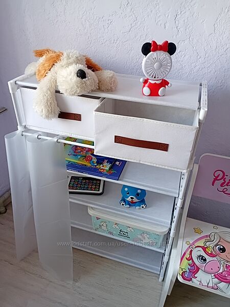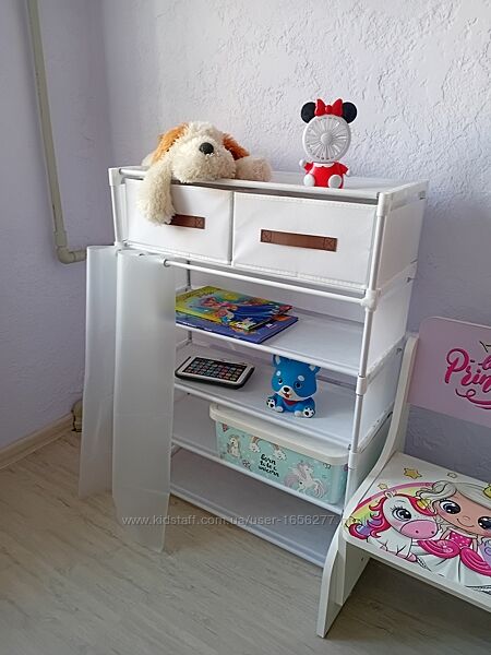 Стелаж або полиця для взуття чи будь яких інших речей. Легко збирається. Не важка, зручно перенести на інше місце навіть дитині. Металиві трубки в поєднанні з щільним флізеліном ( полиці, боковини, задня стінка).Складається з шести полиць + два складаних висувних короба.