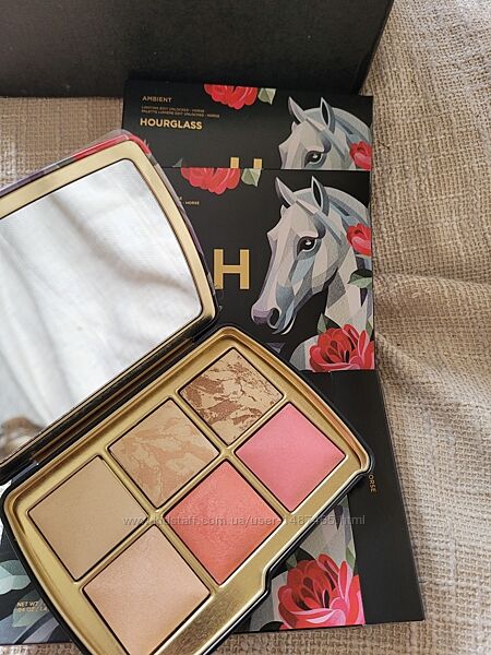 Палетка Hourglass в наявності в найсвітлішому відтінку в обкладинці коня та лебедя.Палетка містить 2 фінішні пудри, 2 рум´ян, хайлайтер та бронзер.
