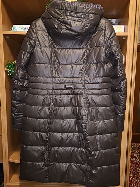 Модель зимнего пальто, пуховика слегка приталенная.Визуальное уменьшение фигуры происходит за счет правильного направления декоративных строчек и вертикальных полос по бокам. Великолепная посадка вытягувает силуэт и акцентирует на изящество форм.Состав ткани: полиэстер 100%
