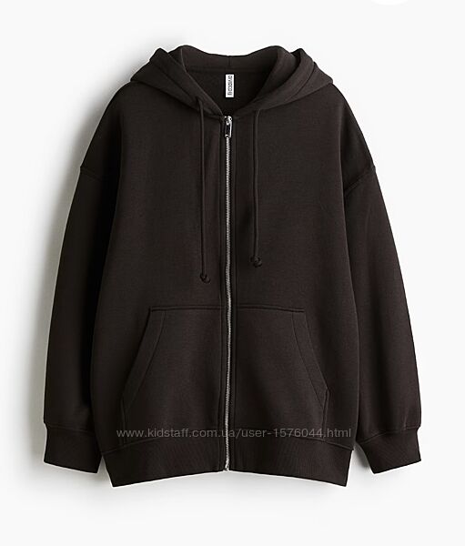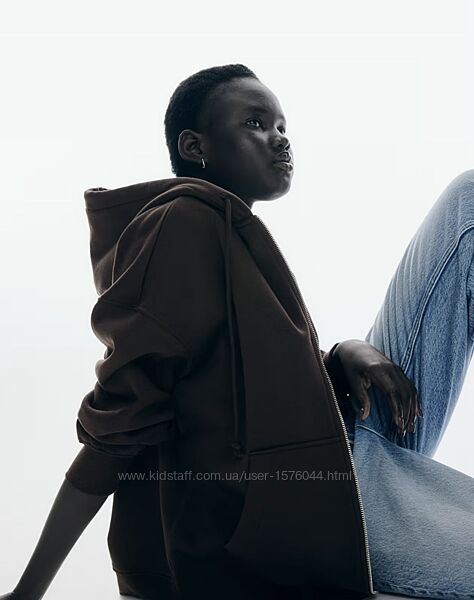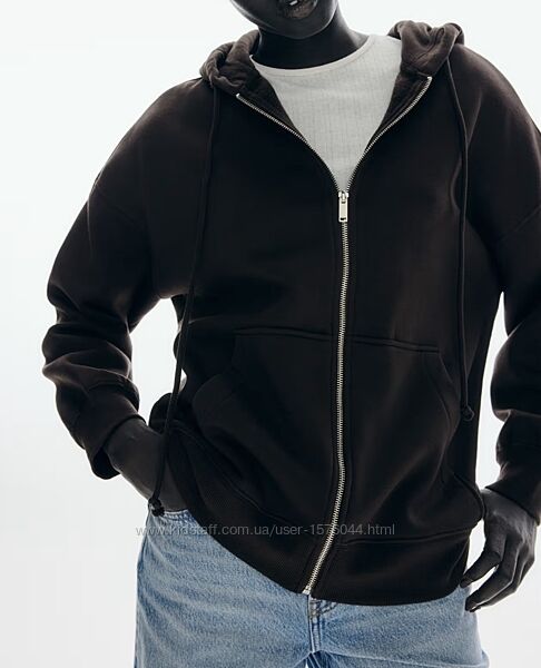 Толстовка из трикотажа вмести с мягким флисом внутри. Двухслойный капюшон, застежка-молния, сильно заниженные плечи. Карманы-кенгуру, рукава и низ с резинкой.