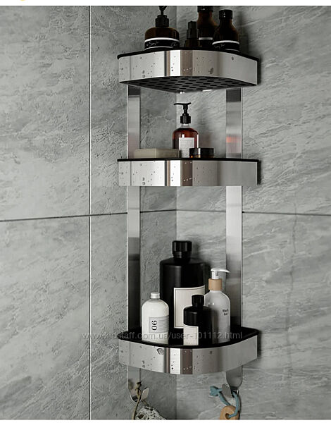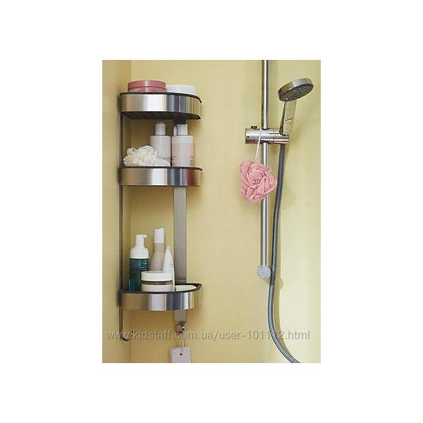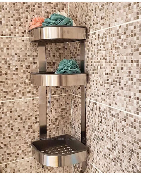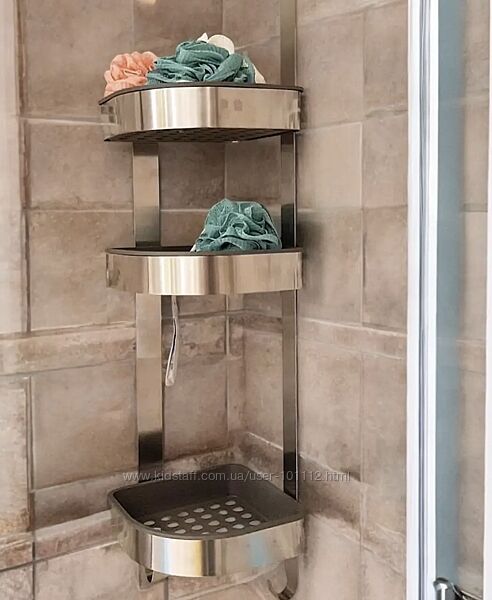 Полки имеют высокие края и расположены на разной высоте, что обеспечивает практичное пространство для больших бутылок шампуня и небольших предметов, таких как губки.