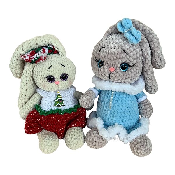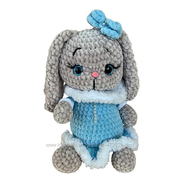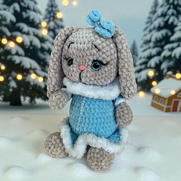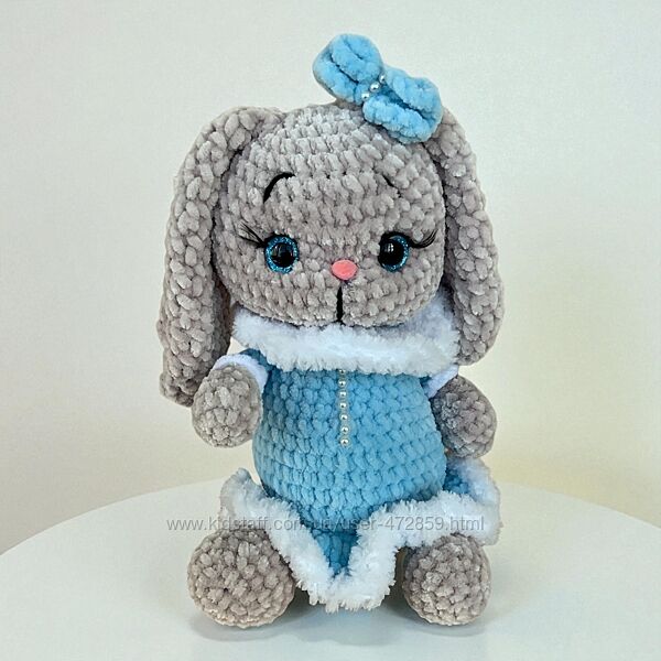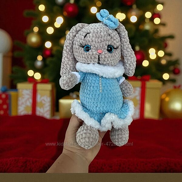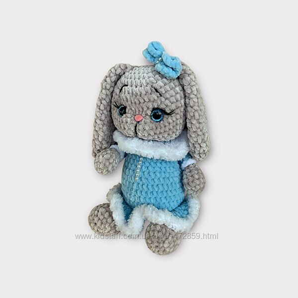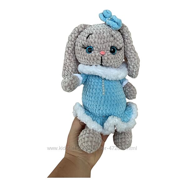 Висота без вушок: 28 смМатеріал: плюшева пряжа (гіпоалергенна, безпечна для дітей)Наповнювач: холофайбер (тримує форму, не злежується)Одяг: блакитна сукня з білою опушкою та бантикомОчі: безпечні пластикові, з яскравими блакитними блискамиРучна робота — кожен зайчик унікальний!🎁 Ідеально підходить: