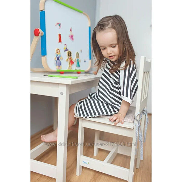 У наборі — 1 столик і 2 стільчики з натуральної сосни, пофарбовані в білий колір безпечними фарбами без запаху.