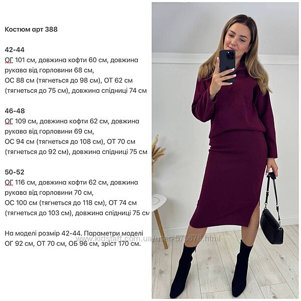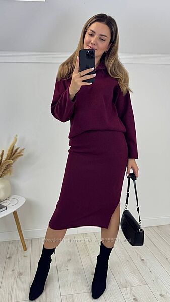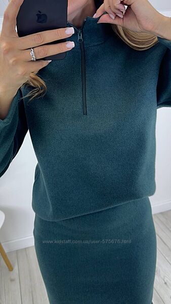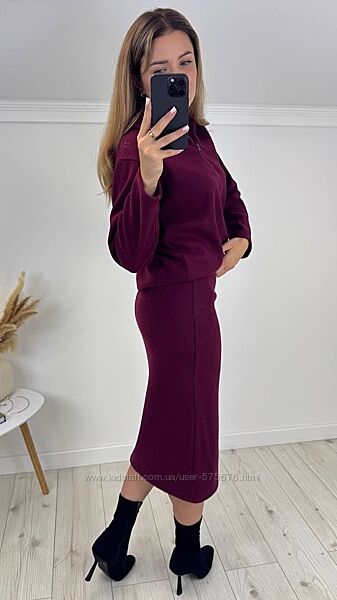Костюм спідниця талія на резинці, збоку розріз. Кофта горловина застібається на блискавку. Тканина мʼягенька, тягнеться, приємна до тіла