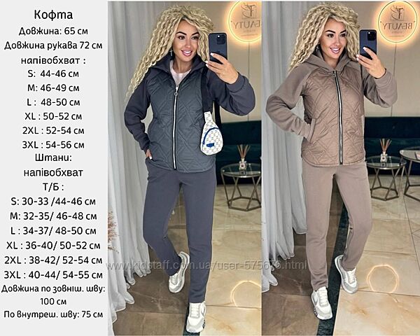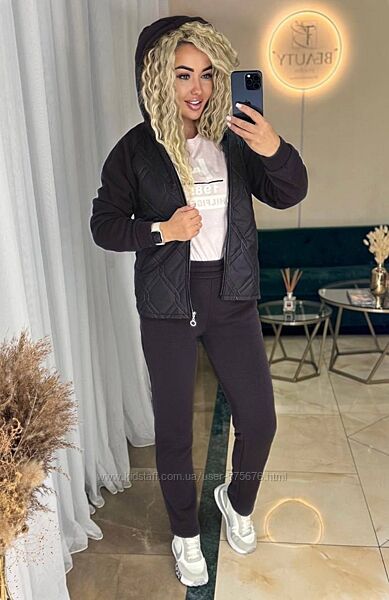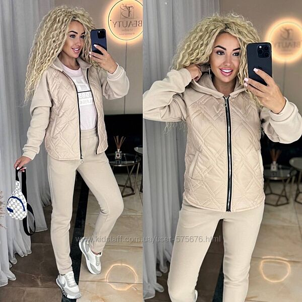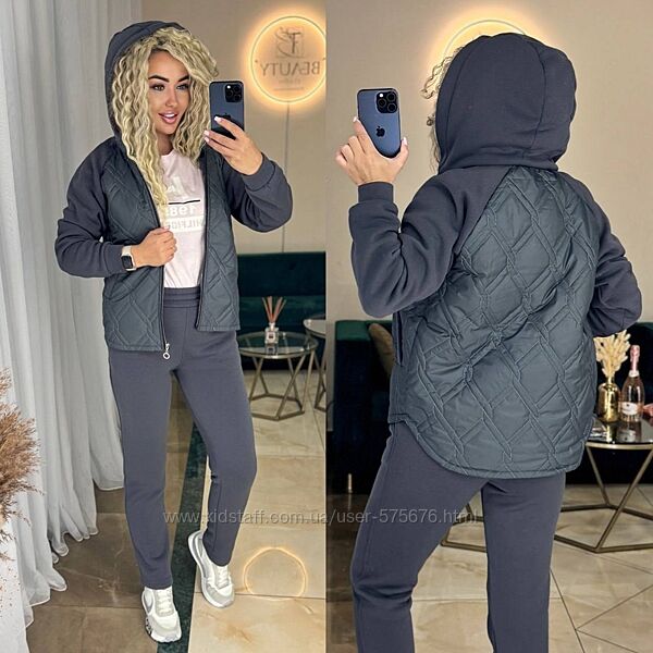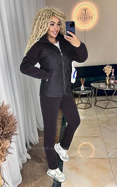 Затишний теплий спортивний костюм із трикотажу на флісі та стьобаної плащівки. Комфортний крій, кофта прямого крою на блискавці( в середині підклад) з кишенями та капюшоном.Штани прямі з кишенями.