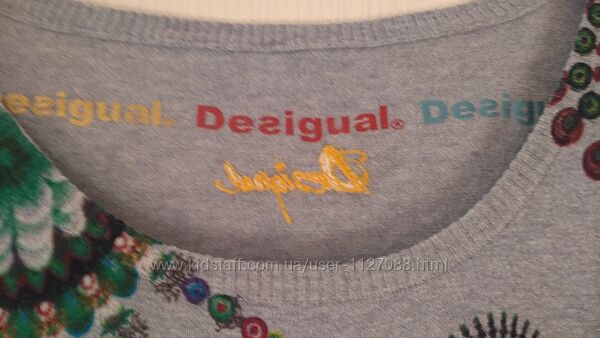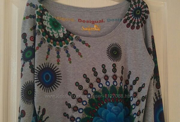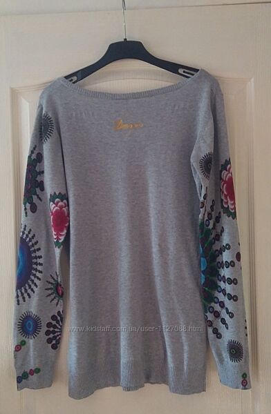 Джемпер Desigual у розмірі XL цікавого дизайну. Дуже мало б/в, стан ідеальний. Тонкий та м´який, приємний на дотик. У складі 100% котон. З глибоким викотом спереду. Заміри: довжина по спинці 68 см, ПОГ 50 см, глибина викоту у спокійному стані 10 см, ширина внизу по резинці 46 см, довжина рукава 67 см. Джемпер тягнеться. Повернення не передбачено.