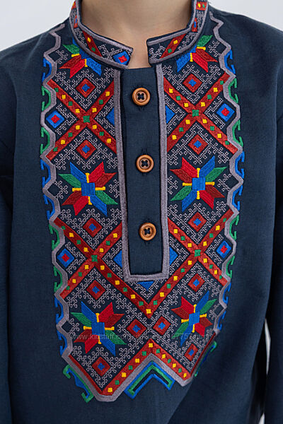 Модель виконана з темно-синього натурального матеріалу – льону, який відмінно пропускає повітря, чудово вбирає вологу та швидко висихає. Завдяки цьому дитина почуватиметься комфортно за будь-якої погоди, що робить сорочку універсальною, всесезонною. Проте вашої уваги заслуговує й сама вишивка виробу, а точніше зірка Алатир, що є частиною орнаменту. Це прадавній український символ, що уособлює могутність і життєдайну силу, приваблює добробут, удачу та гармонію до власника.