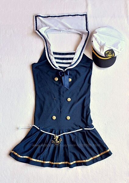 Сексуальний костюм Морячка Капітан для рольових ігор або стриптизу. Матеріал поліестр, тягнеться. Вживаний 1 раз, стан дуже хороший, але є недоліки - відламався гудзик, дивіться фото.В комплекті сукня та кашкет.