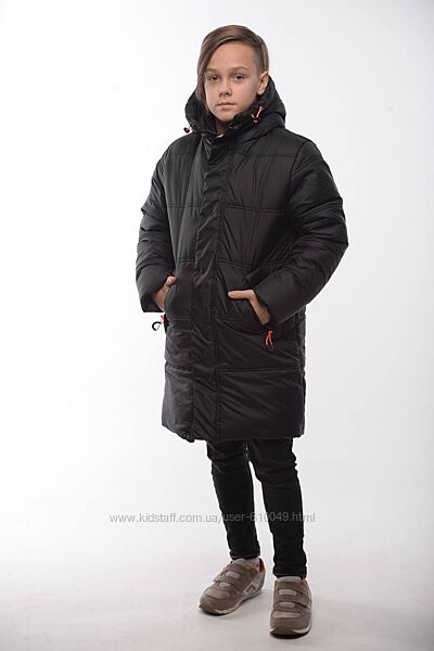 Підліткова зимова подовжена курточка на хлопчиків. Наповнювач синтепух легкий і гіпоалергенний, витримує холод до -25 °C. Силует прямий. М´які в´язані манжети по низу рукавів для комфорту і захисту від холоду. Капюшон регулюються кулісою. Дві кишені на блискавці. Застібка на блискавку з планкою на кнопках.