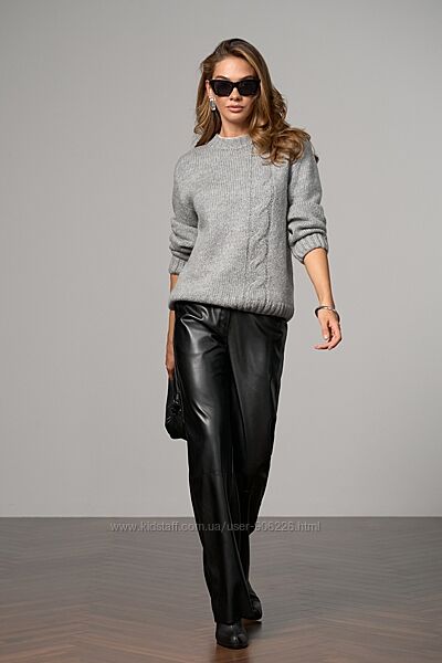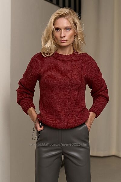 Затишний светр з ніжної вовняної пряжі. Спущена лінія плеча та комфортний рукав. Акцент виробу - вертикальний візерунок "коса".Довжина 59 - 65 см (+- 2 см).
