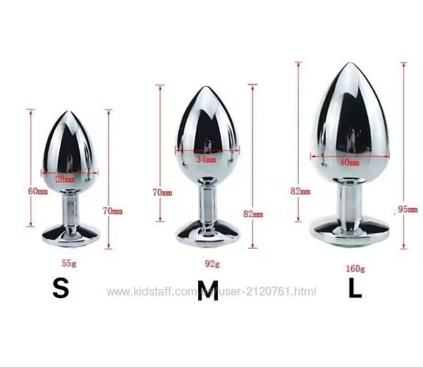 Набор анальных пробок, 3 размера с диаметрами 28мм, 34мм, 40мм. Нержавеющая сталь с кристалом, гладкая, гипоалергенная поверхность.- маленькая (S) диаметр – 2,8 см. (окружность – 8,48 см.), высота – 7,2 см, вес: 50 грамм;