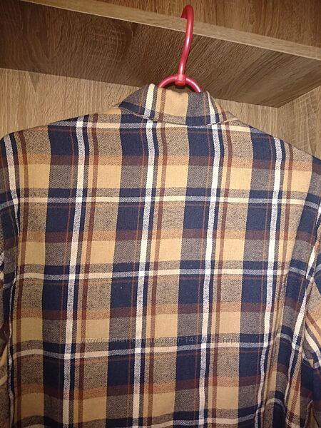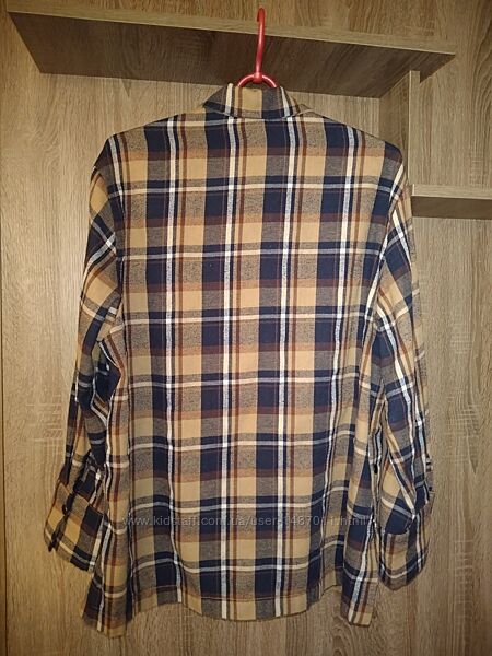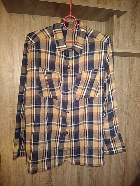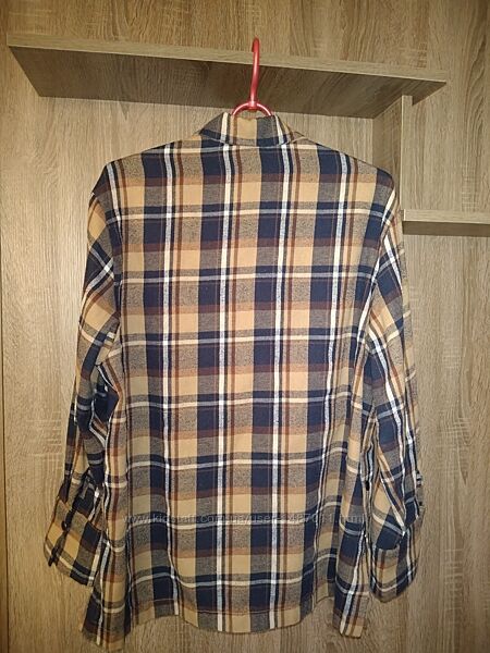 Рубашка блуза блузка кофта Alishis женская в клетку тёплая. Размер 48- 50, расцветка в бежево - синюю клетку. Материал - мягкая тёплая ткань, состав: хлопок с полиэстером. Силуэт свободный, прямой; отложной воротник, два нагрудных кармана, длинный рукав, застёжка на кнопки. По бокам - разрезы, которые тоже застёгиваются на кнопки.Длина 70см, окружность груди 118см, окружность бёдер 124см, длина рукава 57см.