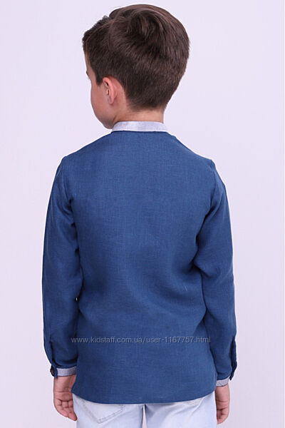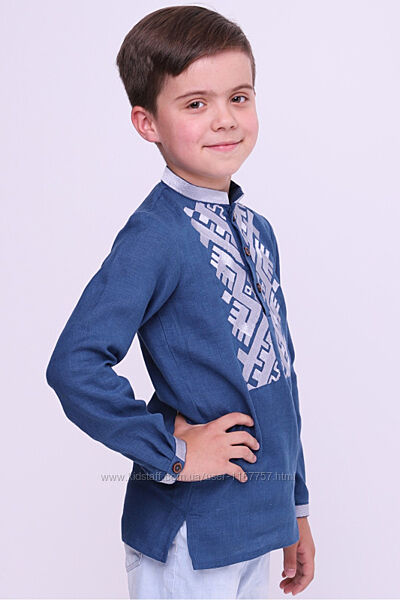 Наша сорочка має суцільний вільний крій та довгий рукав. Вона вільно «сідає» по фігурі хлопчика, не сковуючи його рухів. Сорочка прикрашена красивим орнаментом (акуратна вишивка) на передній частині сорочки, комірці та внизу рукавчика. Синій колір тканини добре контрастує з білим кольором ниток, що додає вишивці додаткової елегантності. Синій символізує спокій та водну стихію.