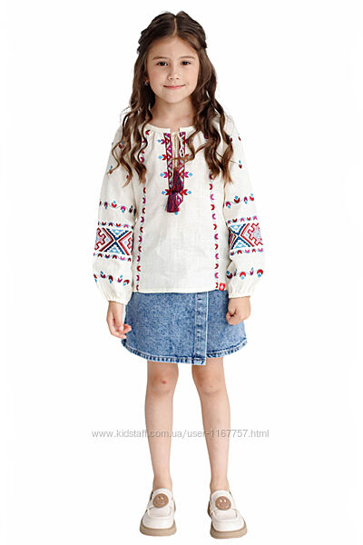 Неймовірно стильна й ніжна дитяча вишиванка для дівчинки! Має вільний крій, прямий силует та довгий рукав, проте головна особливість цієї сорочки у тканині та кольорі вишивки. Вона пошита з натурального льону ніжного вершкового кольору, оздоблена різноколірною вишивкою.Така вишита сорочка пасуватиме дівчинці у будь-якому віці. Вона відповідає національним традиціям, проте має осучаснений вигляд, тому пасуватиме і до класичних штанів, і до джинсів, спідниць, шортів. Це дозволяє її одягати на різноманітні свята, а також на кожен день, коли того забажає дитяча українська душа.