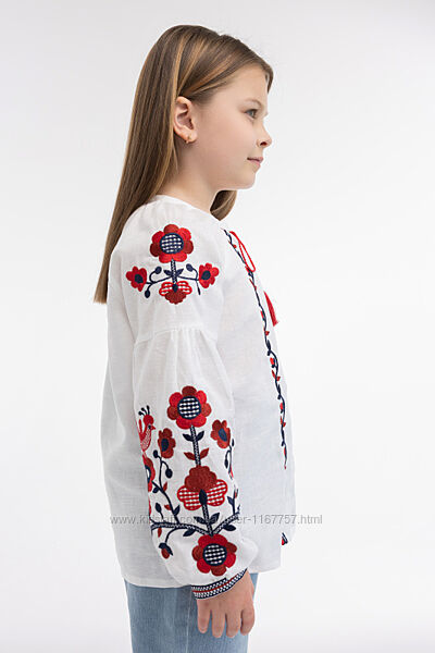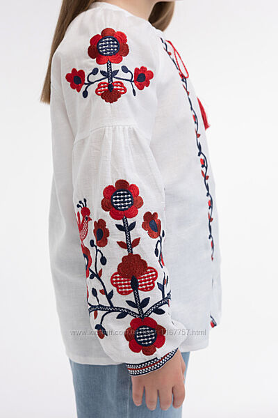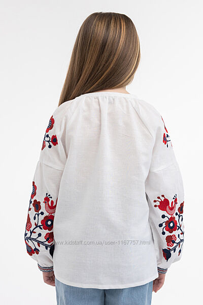 Витончена вишиванка на дівчинку виконана в традиційних червоно-чорних кольорах на білому полотні. Вона є вдалим прикладом поєднання древніх етнічних мотивів та сучасних модних тенденцій, що дозволяє її комбінувати практично з усіма предметами гардероба дівчинки. Це можуть бути джинси, класичні чи сучасні штани, спіднички, комбінезони. Вишита сорочка подарує власниці комфорт від використання та, безумовно, підкреслить її ніжність, чарівність.Білосніжна вишиванка на дівчинку з червоно-чорною вишивкою
