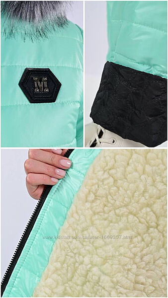 Куртка виконана в модному м´ятному (світло-зеленому) кольорі, застібається на центральну блискавку. Капюшон вшитий (не відстібається) і доповнений пухнастим штучним хутром (екоміхом) для додаткового захисту від вітру та стильного вигляду. Утеплення куртки виконане з використанням синтепону 100. Куртка має зручні бічні кишені.
