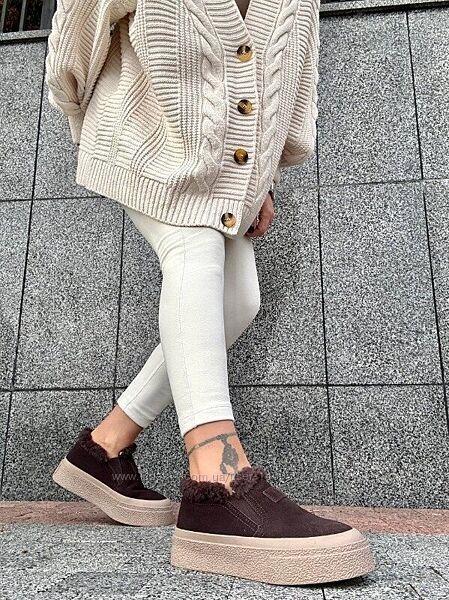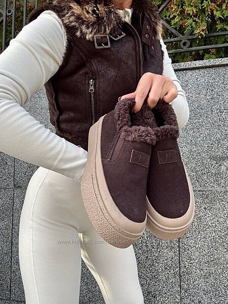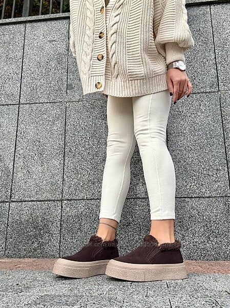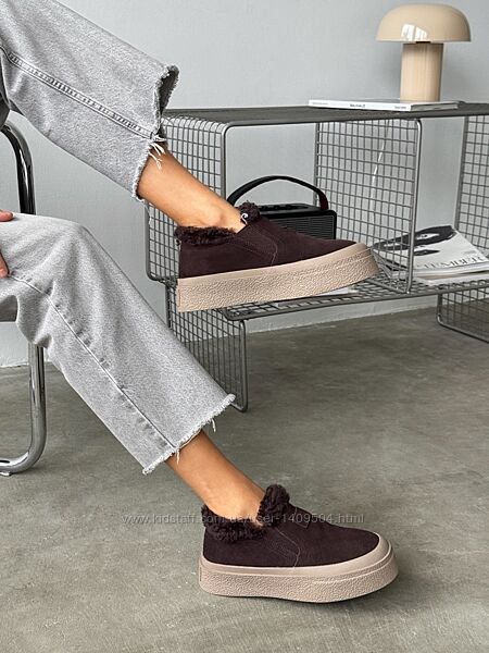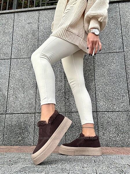 Жіночі зимові черевики-лофери в стильному шоколадному кольорі - поєднання тепла, комфорту та трендового дизайну. Виконані з натуральної замші, вони приємні на дотик і стійкі до зношування. По боках широкі резинки. Опушка з цигейки та всередині натуральне набивне хутро забезпечують м’яке тепло навіть у найхолодніші дні. Завдяки зручній платформі (3,5 см ззаду і 2,5 см спереду) взуття додає висоти, не втрачаючи комфорту.