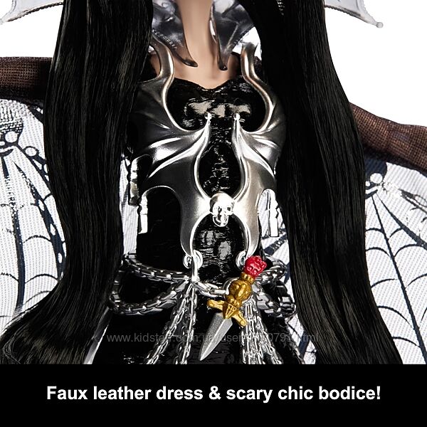 Прокидаються найстрашніші мрії! Monster High об’єднали сили з легендарною Володаркою темряви, щоб створити колекційну фігурку Ельвіри, від якої завмре навіть саме підземелля. Її образ — квінтесенція готичного гламуру: чорна сукня зі штучної шкіри, сріблястий корсет та пояс-ланцюг із кинджалом, готовим до ефектного виходу. Розкішний блискучий плащ із крилами кажана перетворює її на справжню примару сцени.