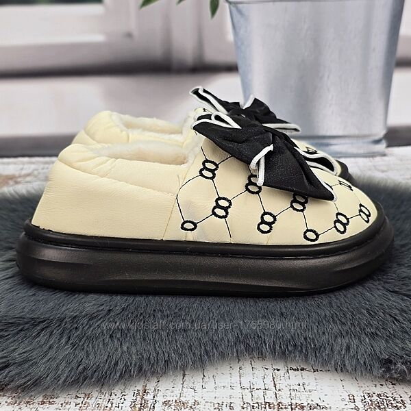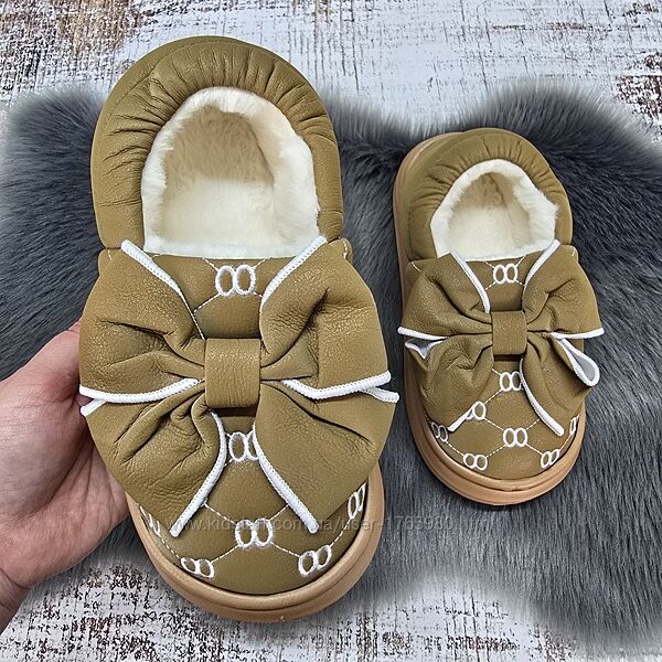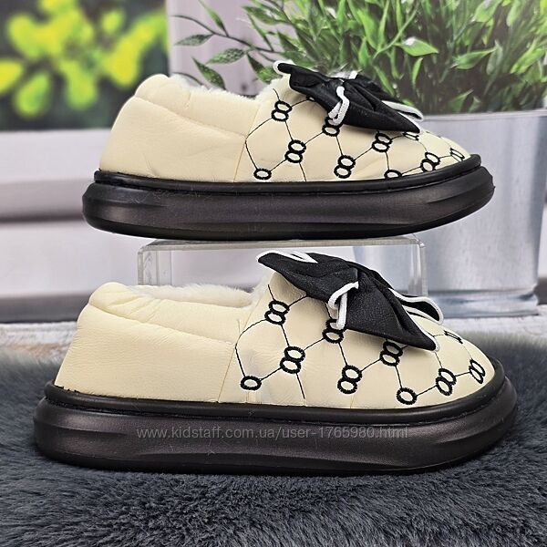 Закрытая форма с мягким краемУтепленная меховая подкладкаВерх с декоративным бантомЛегкая пенная подошваРазмерная сетка модели