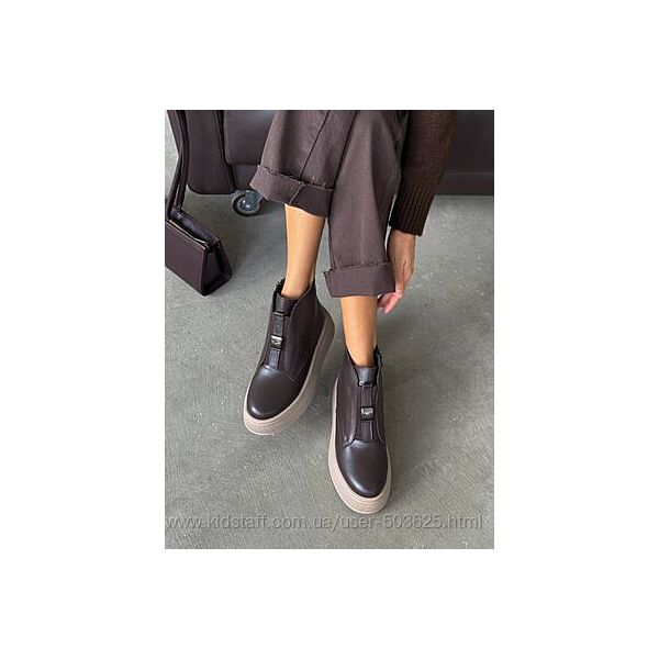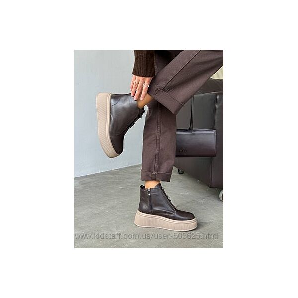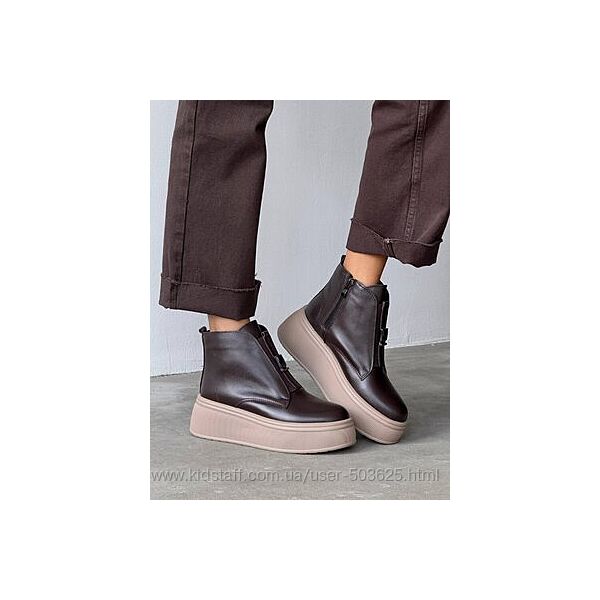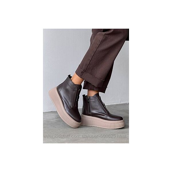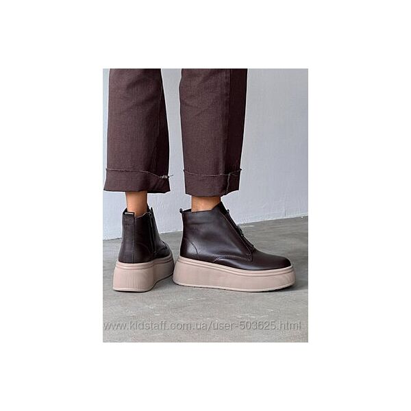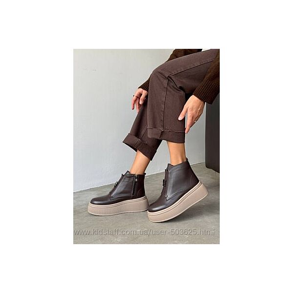 Подробное описание: Шоколадні шкіряні зимові черевики на бежевій платформі