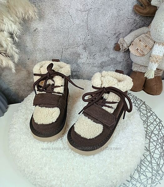 Верх якісний еко-замш+ хутро тедді. Всередині густа овчина 60% натуральна. Фіксація шнурками, зверху липучкою, збоку на замочку. Підходять на будь-яку повноту ніжки. Підошва антиковзна. Температурний режим до - 25°. Дуже легенькі та зручні. Заміри вказані від краю до краю устілки.