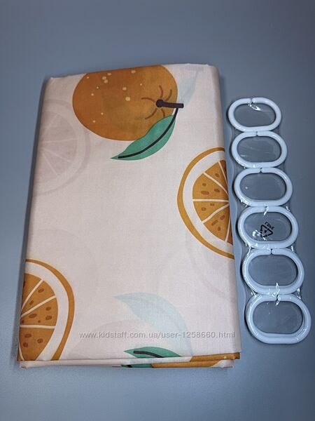 Фіранка для душу з 12 вшитими люверсами, з поліпропіленовими кільцями для кріплення.Тканина, що легко чиститься, можна прати при температурі 40°C.