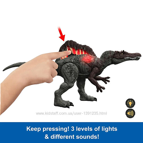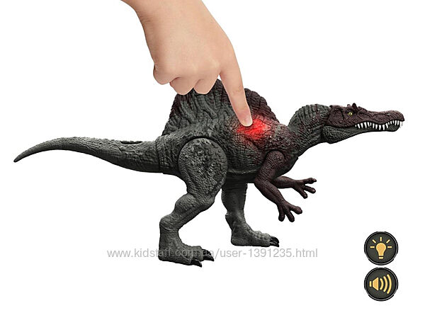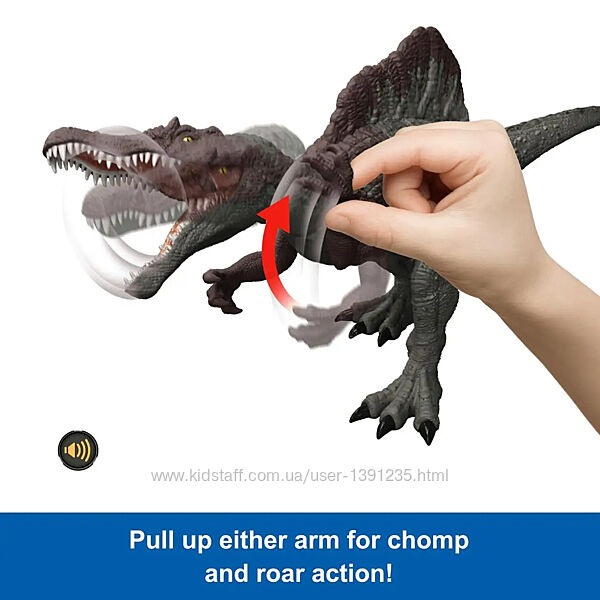 Епічні атаки! Ця фігурка Battle Slashin´ Spinosaurus готова до бою з багатьма функціями битв і пошкоджень, а також має деко болотного кольоруЖвав і рев! Потягніть будь-яку руку вгору, щоб активувати човкання та ревіння голови, що обертається вбік, на цьому спинозаврі довжиною понад 21 дюйм
