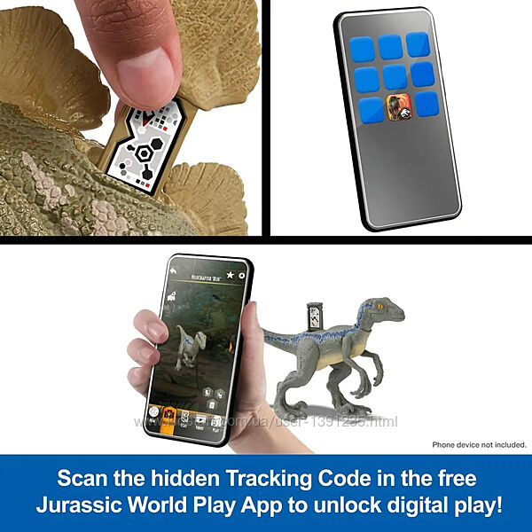 Цифровий динозавр та ігри! Відскануйте прихований код відстеження в безкоштовному додатку Jurassic World Play за допомогою сумісного смарт-пристрою (не входить у комплект), щоб зібрати цифрового динозавра та грати в надзвичайно веселі ігри!
