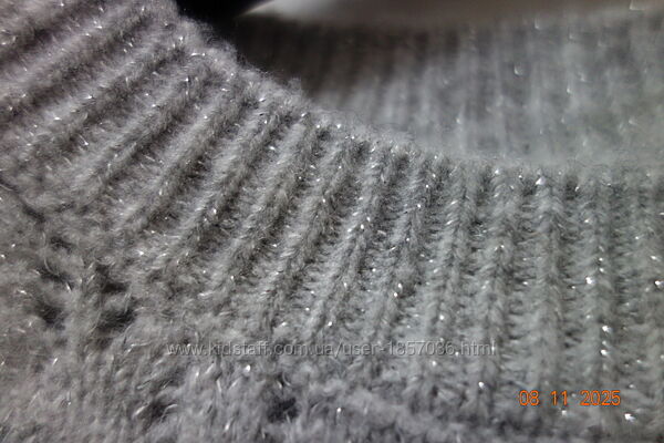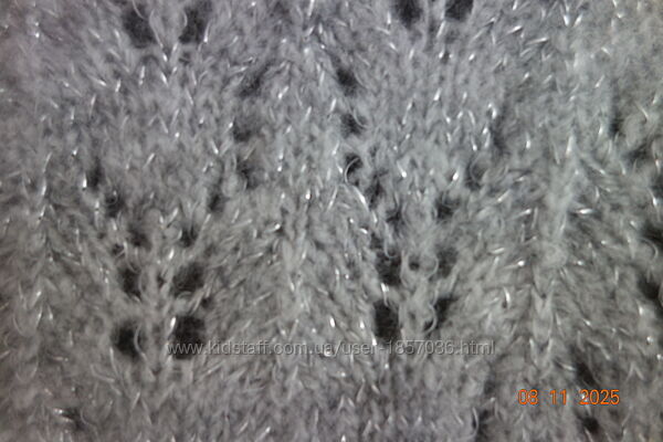Новий, без дефектів. 5% вовна, 4% металева нитка, 1% еластан, пе, па.Ніжний м´який пухкий приємний до тіла. На спині гладка в´язка, без візерунку.