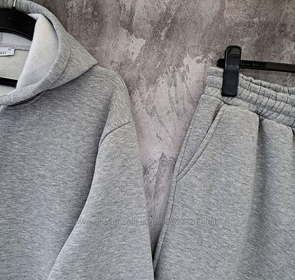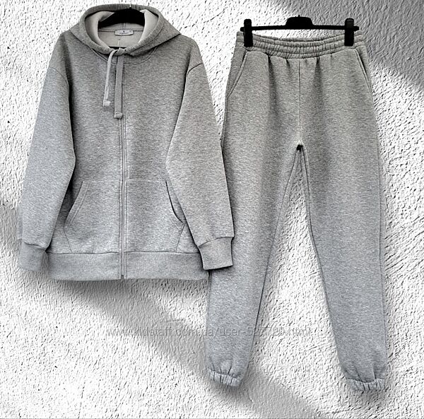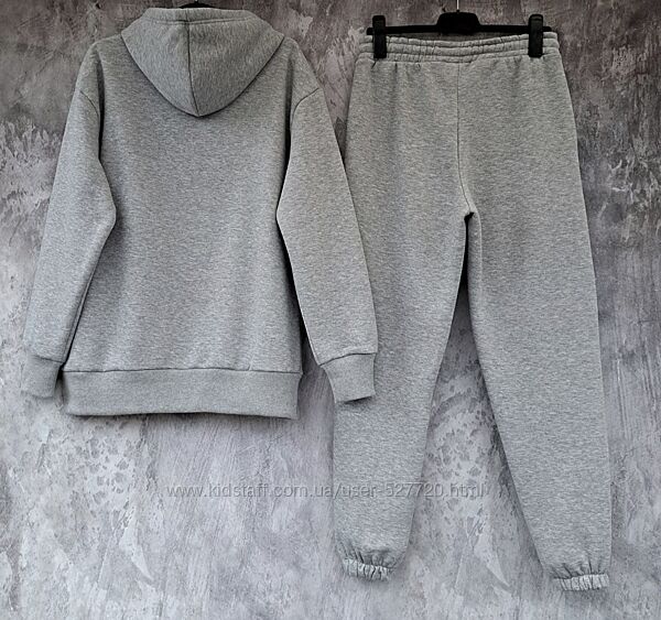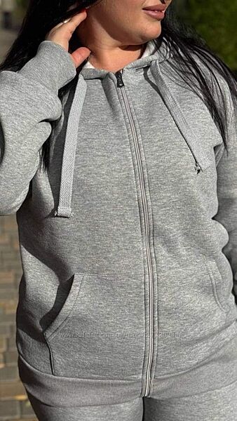 наявність уточнюйте будь ласкаЖіночий теплий трикотажний костюм: кофта+штани. Кофта з капюшоном, застібається по всій довжині на блискавку, плечовий шов приспущений, кишені-кенгуру, манжети в рукавах та низ виробу виконані з еластичного трикотажного матеріалу рибани; пояс у штанах на резинці, регулюється з внутрішньої сторони шнурівкою, комфортна посадка, є бічні відкриті кишені, низ на резинці.