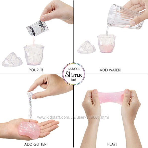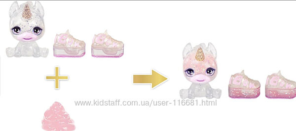 У набір входить 11-дюймова лялька з повним ляльковим вбранням і чарівними блискітками на обличчі, лялькове взуття, що налаштовується, сумочка, що налаштовується, чарівний вихованець з рогом, що налаштовується, набір для самостійного виготовлення слайма — 1 пакетик порошку слайма + 1 пакетик блискіток + 1 кристалічний шейкер для приготування та зберігання слайма.