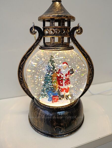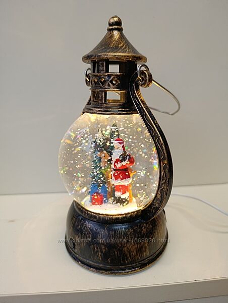 Новогодний фонарик, очень красивый! Стеклянный шар с делом морозом. Высота фонарика 20 см.Работает от 3х батареек, сети или пауэр банка. Прекрасный подарок и декор на праздники.