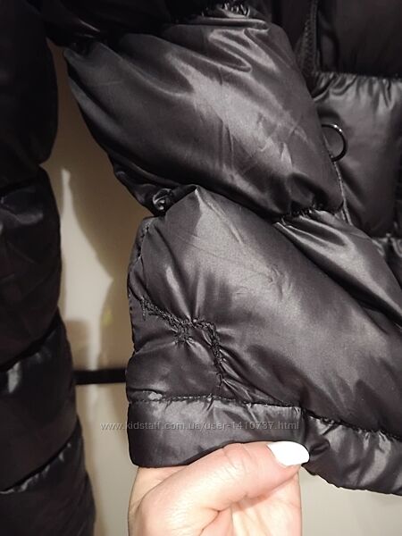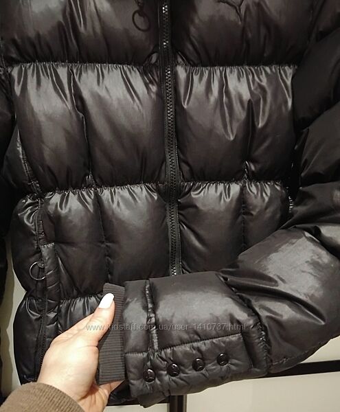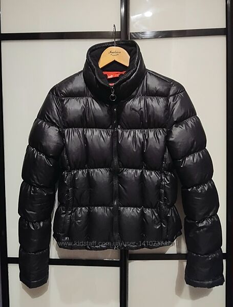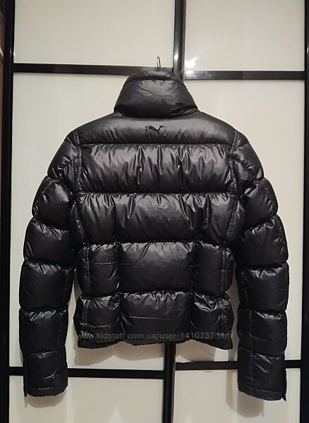 Продам чёрную,зимнюю куртку из коллекции Puma. Утепленная,выполнена из стеганого материала добротно и качественно.Модель с наполнителем из натурального пуха и перьев гарантирует высокий уровень изоляции от холода. Манжеты на резинке, рукав на кнопках. Внутри имеется карман на молнии,в области шеи флис. Оригинал. Покупала в магазине в Германии. Общее состояние отличное, но есть деффект и это учла в цене... Поврежден материал(сбоку),который устраняется в ателье( на фото показала)... Размер указан XS но подходит и на S. Заміри: Ширина в груди 48 см Длина без воротника 56 см Высота воротника 11 см