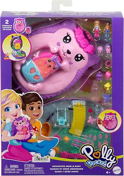 Ігровий набір Polly Pocket «Мама та малюк їжачок» у формі сумочки відкривається та пропонує розвагу 2-в-1 з квітучим садом та ліжечком для тварин.