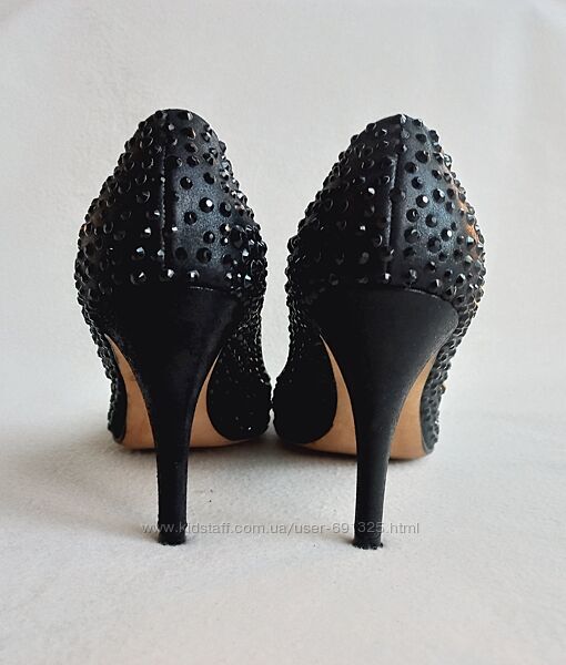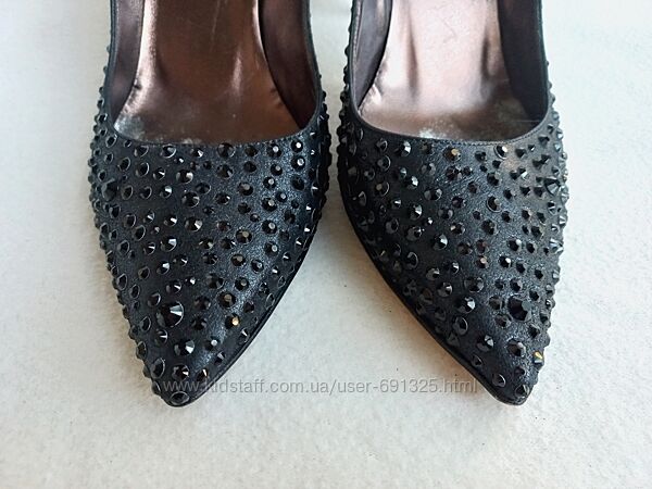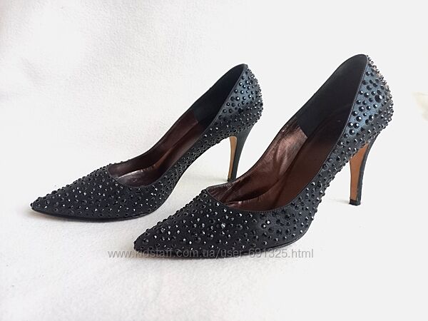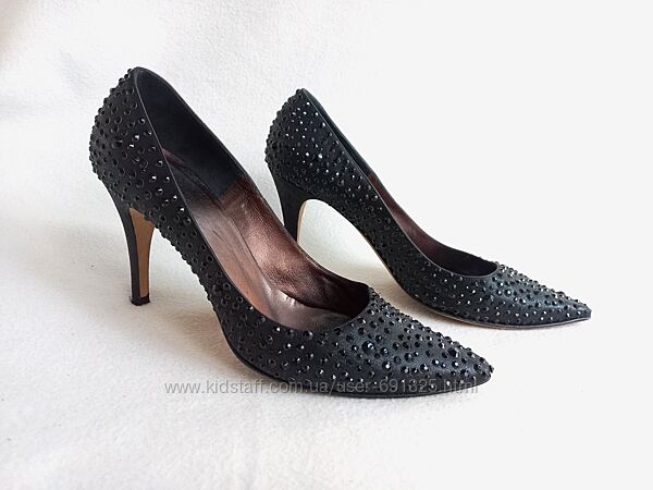 Пропоную чорні нарядні туфлі з натуральної шкіри від RODO. Прикрашені чорними стразами. Вживані 1 раз акуратно, стан ззовні ідеальний, всередині потерлася устілка.Розмір вказаний 38 1/2, довжина устілки всередині 26,5 см за рахунок гострого носочка, ширина 8,3 см, каблук 9,5 см.