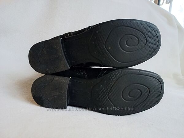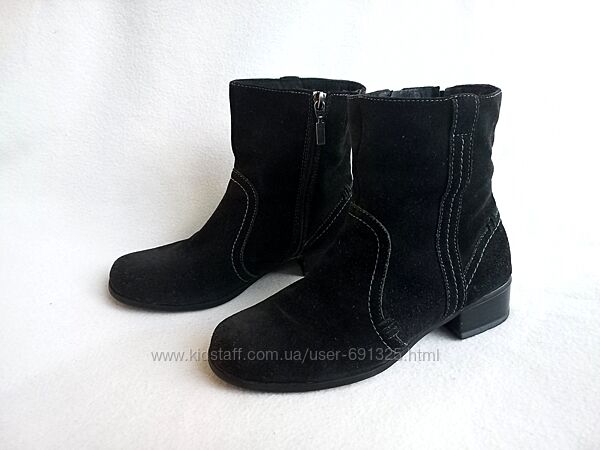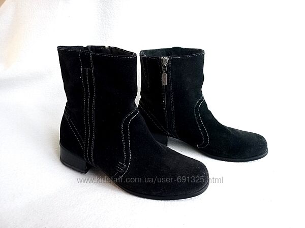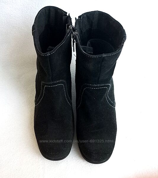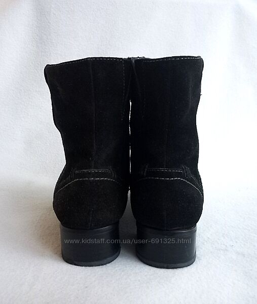 Пропоную чорні демісезонні замшеві напівчоботи від Footglove. Вживані мало, акуратно, стан дуже добрий, залисин немає, дивіться фото.Розмір вказаний 4, довжина устілки всередині 24 см, ширина 8,5 см, каблук 3,5 см, окружність щиколотки 29+2 см.