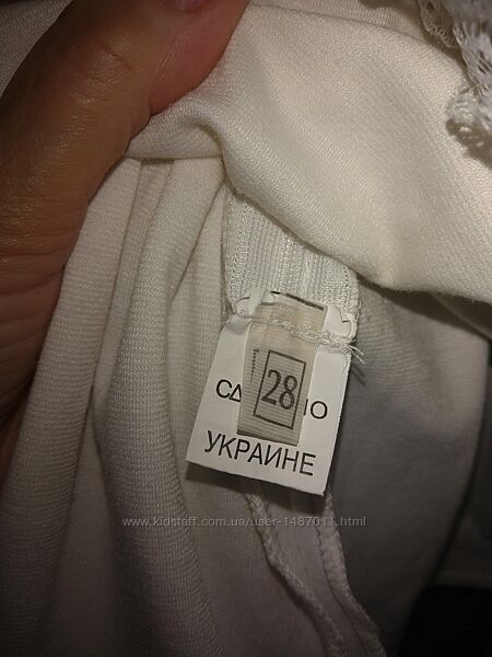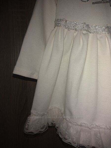 Платье белое нарядное трикотажное для девочки. Размер на маркировке указан 28 - это подходит для детей от 1,5 до 3 лет, рост 92–98 см. Платье отрезное по линии талии, с круглым вырезом горловины, длинным рукавом; сзади - застёжка "молния". Платье украшено кружевными оборками, бусинками и стразовым блестящим принтом. Материал - мягкий трикотаж, хлопок с добавкой полиэстера.Длина 43см, окружность груди 56см, окружность бёдер 65см, длина рукава 30см.